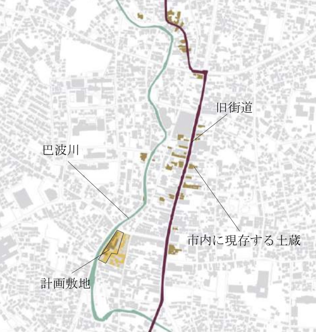 栃木県栃木市の街道と河川、そして現在の残る蔵の配置の分析。蔵の建築的特徴を考察しながら、河川の沿いに残された蔵づくりの建物が多く残された一画を再生する。