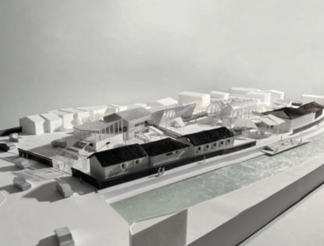 川沿いの蔵を活かし、奥側には新しい建築を対比的に配置する。