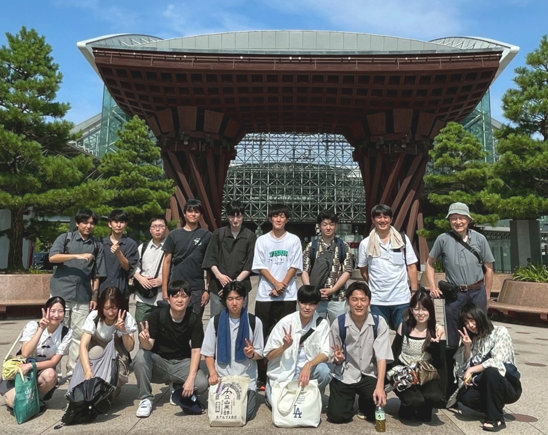 教員2名と両研究室所属の学生15名が参加し、金沢駅の鼓門や近江町市場、金沢21世紀美術館などの著名建築を視察した。