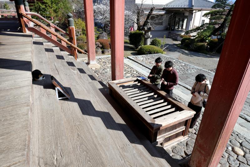 甲斐善光寺では、三毛猫に手を合わせていました。