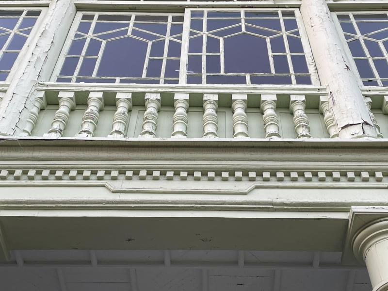 これはコロニアルスタイルの特徴であり、神戸北野の異人館に多く見られる。風通しと日差しを遮るベランダを配したアジアの様式が採用されている。