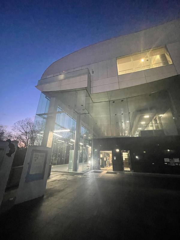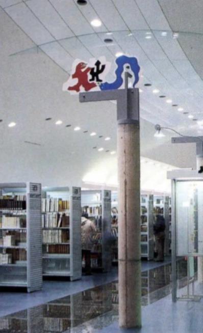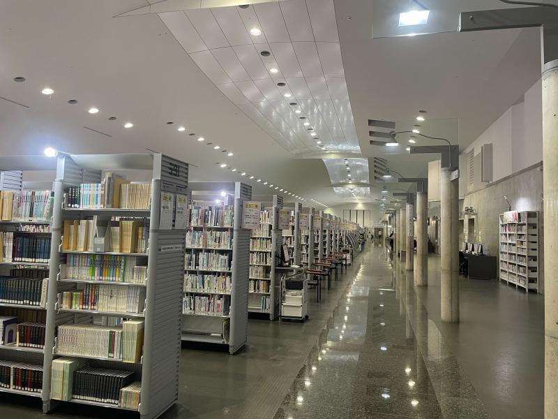 宮城県図書館の空間構成では、建物が地形と調和しつつ、200mの長大なリニアプランに書架85列が展開される点が印象的である。長さ方向に来館者を連続して歩かせる構成は、視線や音、人の流れ、本との出会いを生み、館内を一種の街路のように経験させている。一方で、この線状性や書架の多さは迷いやすさも生む。その点に対してサインアートを用いて視覚的に見やすくなる工夫を施している。