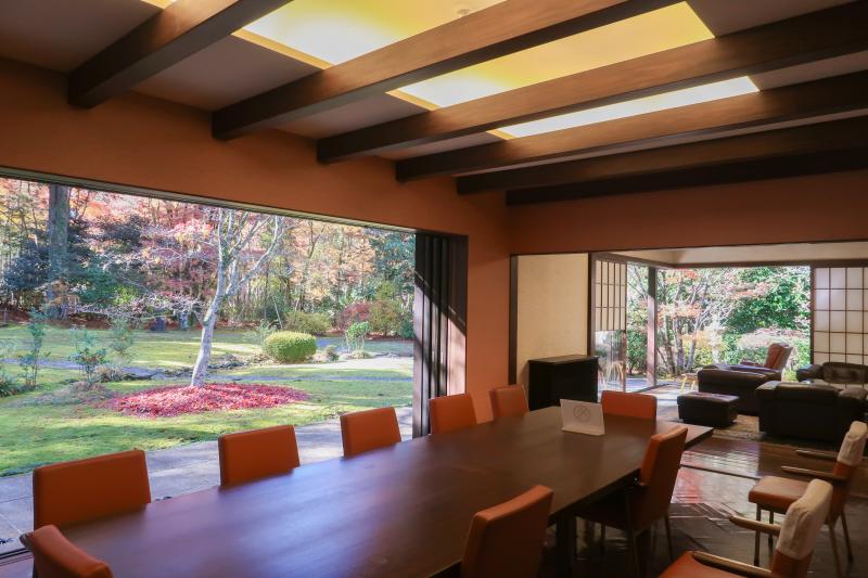 居間や食堂の開口部では、外部空間との連続性を高めるために、壁へ引き込む押込戸を採用している。雨戸、網戸、ガラス戸、障子戸をすべて開放した際に戸袋がないことで、視界を遮るものがなくなり、開放された空間が半屋外のような状態となる。食堂の建具枠に関しては、極限まで薄くすることによって、内外の境界を感じさせない工夫をしていた。また、これらの建具には、数寄屋の意匠を利用しながらも、現代的な工業生産されたアルミサッシを適材適所で利用しており、伝統意匠の中に現代の技術を取り込む手法を見ることができた。