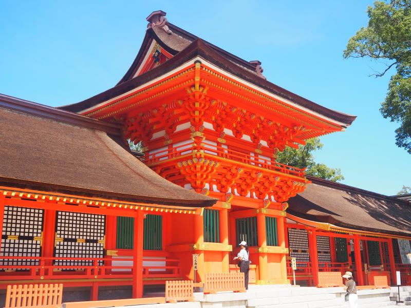 参道は緩やかな坂になっており、道中若宮神社をはじめとする多くの摂末社が点在していた。それだけ境内も広大であり、宇佐神宮の荘厳さが感じられた。参道は豊かな自然に囲まれており、社殿の朱が緑の中に際立つ景観を形成しており、大きな鳥居や楼門を潜る度に浄化される気持であったが、その先に辿り着いた南中楼門と本殿は、その規模と意匠の美しさにおいて特に印象的であった。