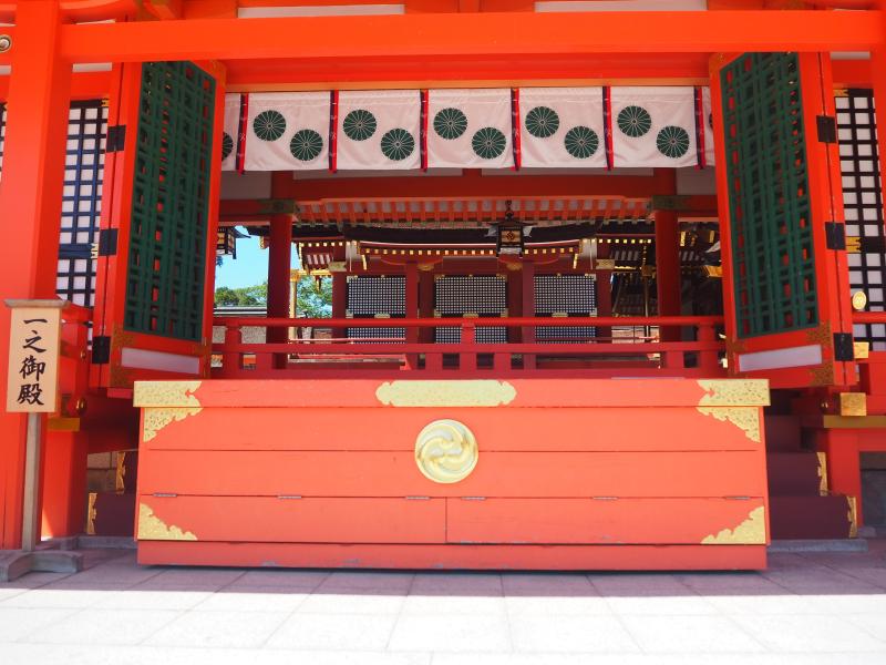 本殿には、八幡様として知られる応神天皇(誉田別尊)を主祭神として第一殿に祀り、続いて第二殿に比売神と第三殿に神功皇后(大帯姫神)を祀る三社殿から成り、東西に並んでいる。