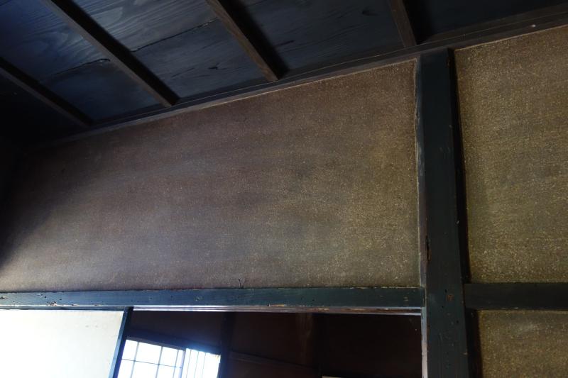 土壁は劣化しやすい特徴があるが、全体的にひび割れなど外観上目立ったところがなく保存状態がよかったことで客用の部屋と比べて土壁による部屋の暗さが際立ち、壁の意匠による公私の部屋の空間の区別が明解であった。