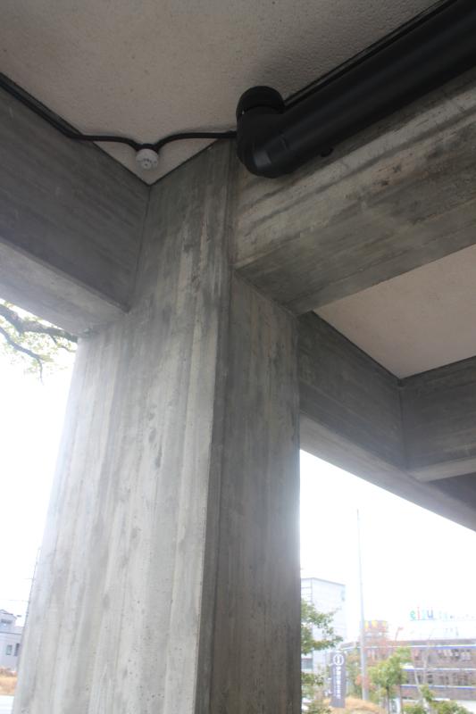 外観においては、坂倉準三が設計した当時の姿が維持されている。斜面地に沿って配置された3層のボリュームは、ピロティによる階層の抜けなど多様な手法を用いて明快に表現されている。ディテールに目を向けると、コンクリート打設時に一般的なコンパネではなく、木目が転写される型枠が採用されている点に特筆すべき工夫が見られる。さらに、その木目は単一方向ではなく、部材や場所に応じて方向が変えられており、細やかな意匠の操作がうかがえる。