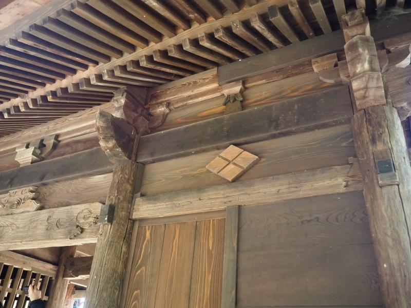 本殿においては、木鼻の形状がやや長方形を呈しており、彫りも深いといった意匠的特徴が見られる。棟札には元亀2年や正徳元年など複数の建立記録が残されているが、こうした彫刻の様式からは、より新しい時代(正徳元年頃)の建築的特徴が表れている。さらに、細部の装飾に天皇家や武田家を示す家紋が確認できたことから、極めて格式の高い神社であることを感じられた。一方、随身門では、建物の規模に対して軒の出がやや小さく切り詰められている印象を受けた。その要因として、周囲に樹木が近接しているという立地条件上、物理的にこれ以上深い軒を張り出す空間的余裕がなかったのではないかと考えられる。自然環境と建築の納まりの関係性を示す実例として、興味深いものであった。