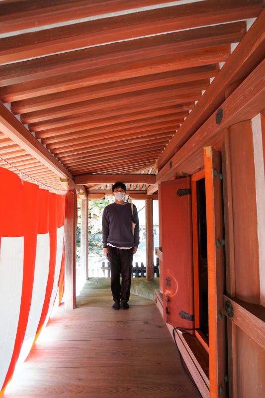 今回は五重塔初層の御開帳の時期だったため、内部の拝観をすることができた。内部は四天柱に囲まれた方一間を内陣とし、四面に板扉を付けて厨子のような形態となっている。初層の天井は外陣・内陣ともに内法長押の上に折上小組格天井を張り、内陣は外陣よりも長押の位置が高いため天井がより高くなっている。