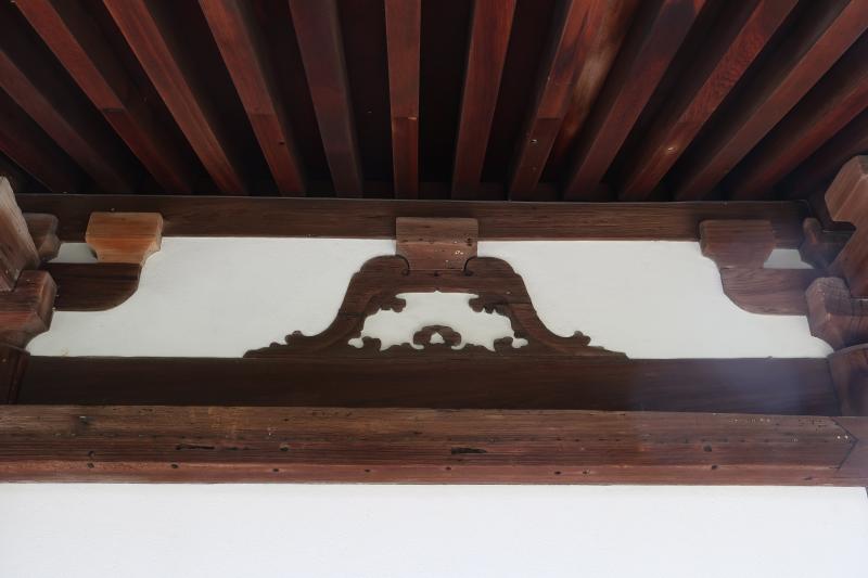 小規模な建物で、内部には柱を設けず、側柱に虹梁を架け、板蟇股と三斗組を載せて化粧棟木を受ける。組物は平三斗で、枠肘木の一方は巻斗を載せて虹梁を受け、一方は肘木尻を外に出す。中備の蟇股は、鎌倉時代らしい線が細く繊細な意匠だった。