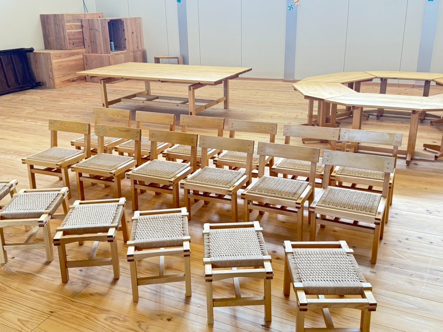 大きい机1台、小さい机6台、背もたれ付き椅子12台、スツール6台の製作をしました。
