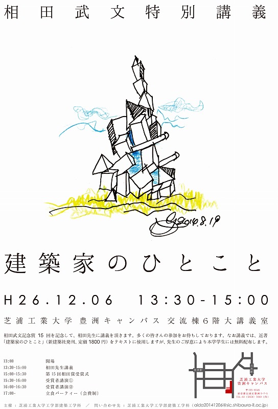 相田武文記念賞15 回を記念して、相田武文先生に講義を頂きました。なお講義では、近著「建築家のひとこと」(新建築社刊)をテキストに使用し、先生のご厚意により本学学生には無料配布されました。