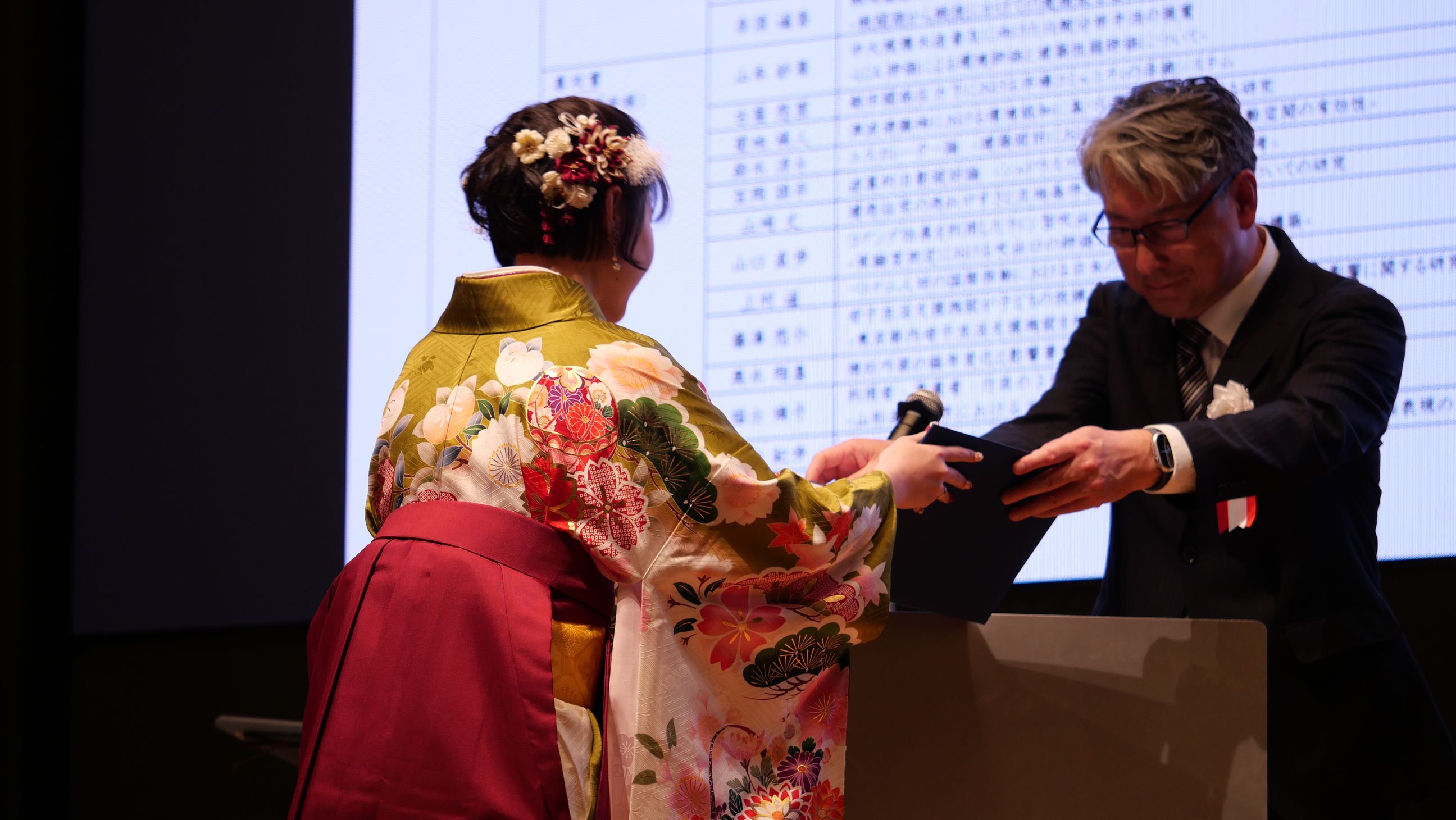 閉式後、研究室ごとに卒業生と修了生に指導教員から学位記が手渡されました。