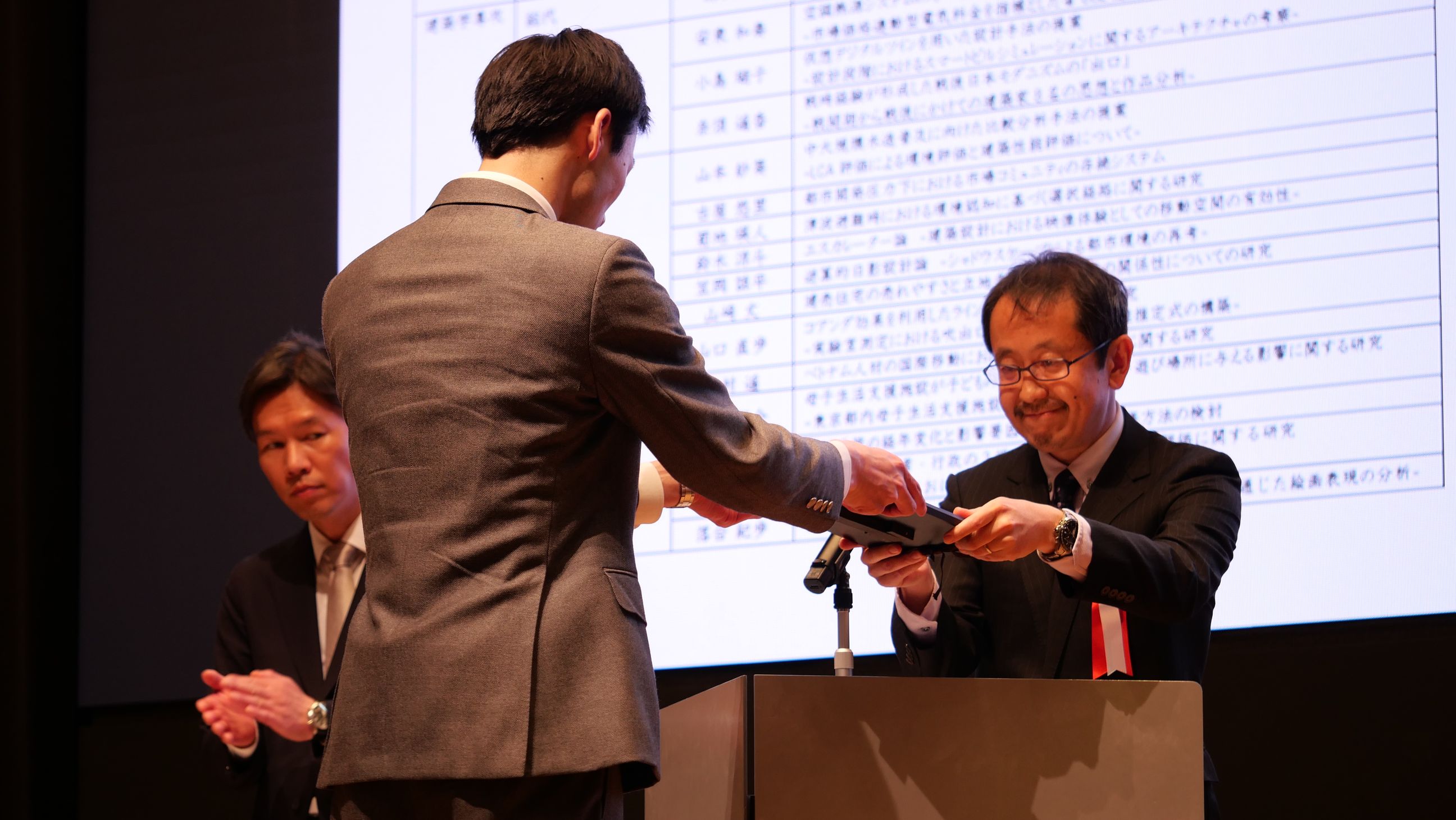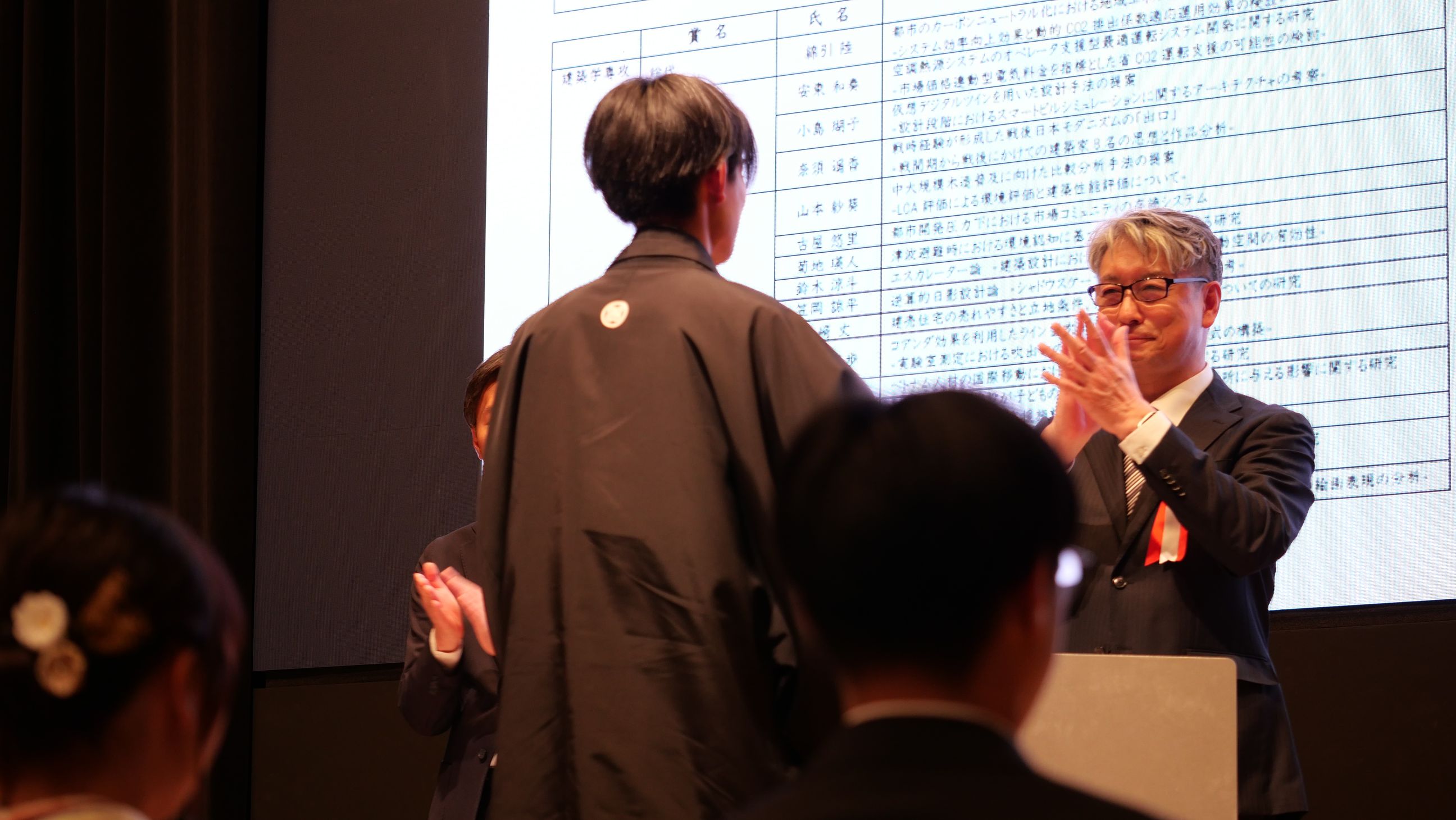 建築学部建築学科の第6回卒業生、⼤学院理⼯学研究科建築学専攻の第4回修了生については、17時00分から、交流棟大講義室にて、建築学科の学位記・表彰状授与式が行われました。