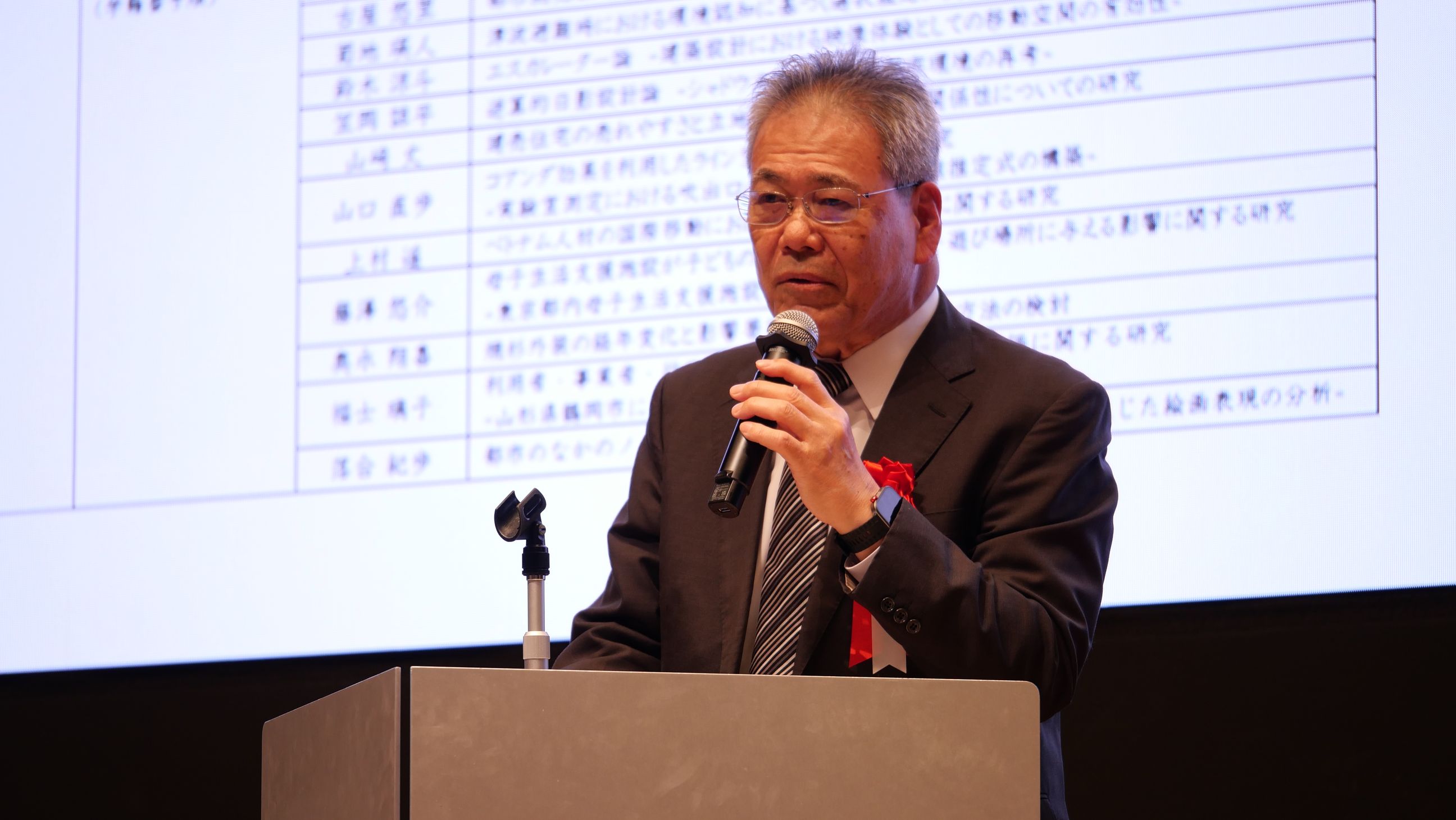 秋元学部長による式辞、学位記・各賞授与、芝浦建築会会長 㓛刀強氏の祝辞の後、本年度で退任される隈澤文俊先生、古賀純子先生、浅田勇人先生、中島直道先生よりご挨拶のお言葉をいただきました。
