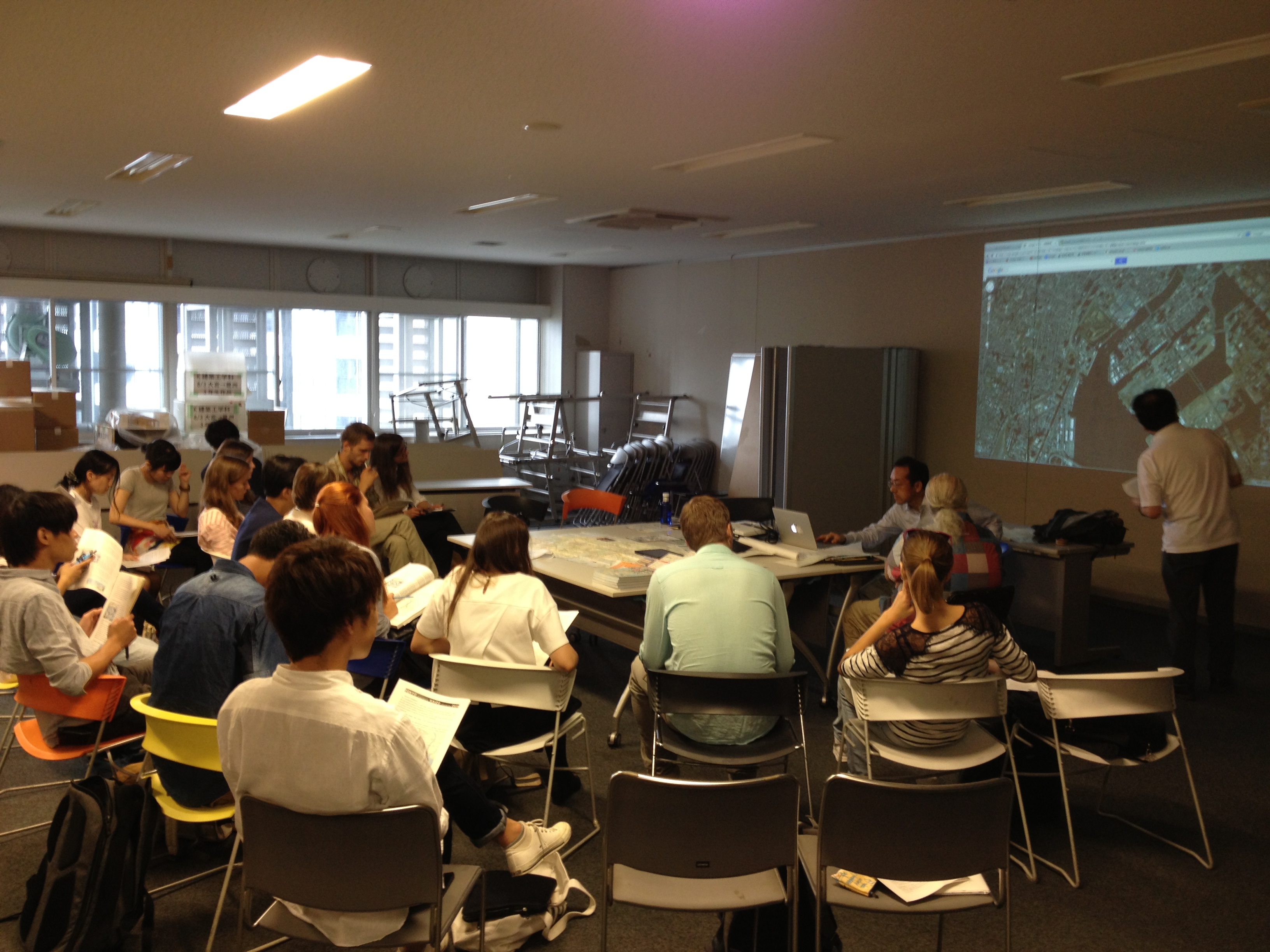 ロシアのモスクワ建築大学(MARHI)と芝浦工業大学による交換プログラムが終了しました。毎年、東京とモスクワを交互に舞台として行っている交換プログラムです。今年はモスクワ建築大学の学生10名、教授1名の計11名が一ヶ月間東京に滞在し、豊洲キャンパスにて2020年の東京オリンピックへ向けた「東京改造計画」をテーマとして取り組みました。敷地を虎ノ門・築地市場・浜離宮・お台場と、加えてそれらを繋ぐ新虎通りを含めて一体に設定して計画を提案しました。これら5つの敷地を、各大学から2名ずつの計4名で分担し、設計の進め方や文化・習慣の違いに悪戦苦闘しながら、計画を発表しました。