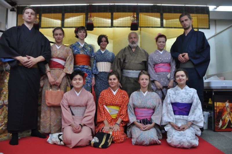 ロシア人学生、教授による着物の着付け体験。